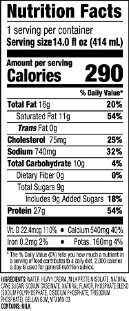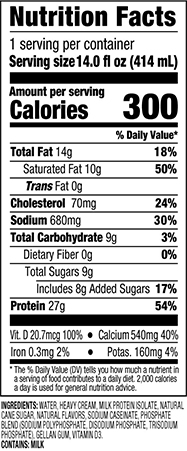 Water, Heavy Cream, Milk Protein Isolate, Natural Cane Sugar, Natural Flavors, Sodium Caseinate, Natural Cocoa Powder, Phosphate Blend (sodium Polyphosphate, Disodium Phosphate, Trisodium Phosphate), Natural Cocoa Extract, Gellan Gum, Vitamin D3